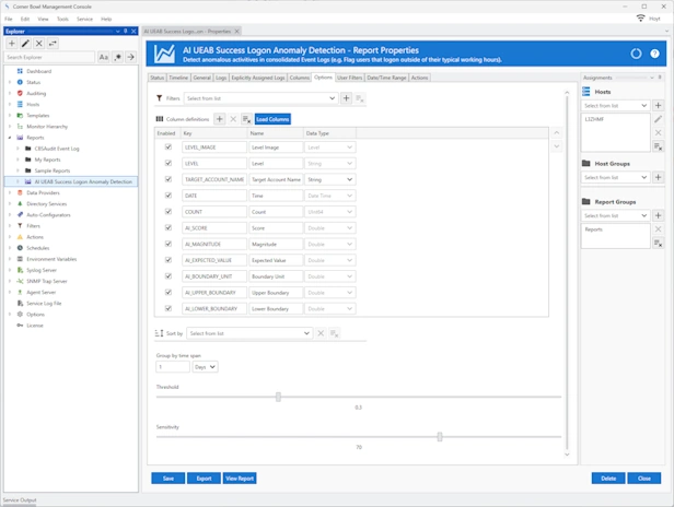 Out-of-the-box User and Entity Behavior Analytics (UEBA) AI generated Security Reports to identify anomalous activity. Create, customize and generate your own reports to detect anomalous activity from any device's audit logs.