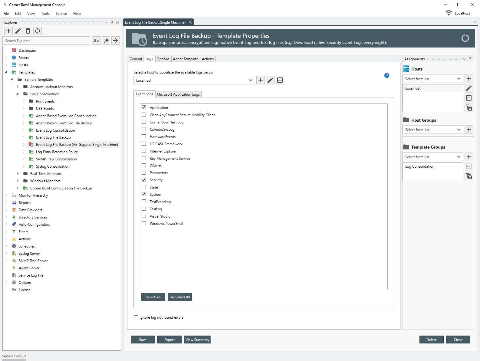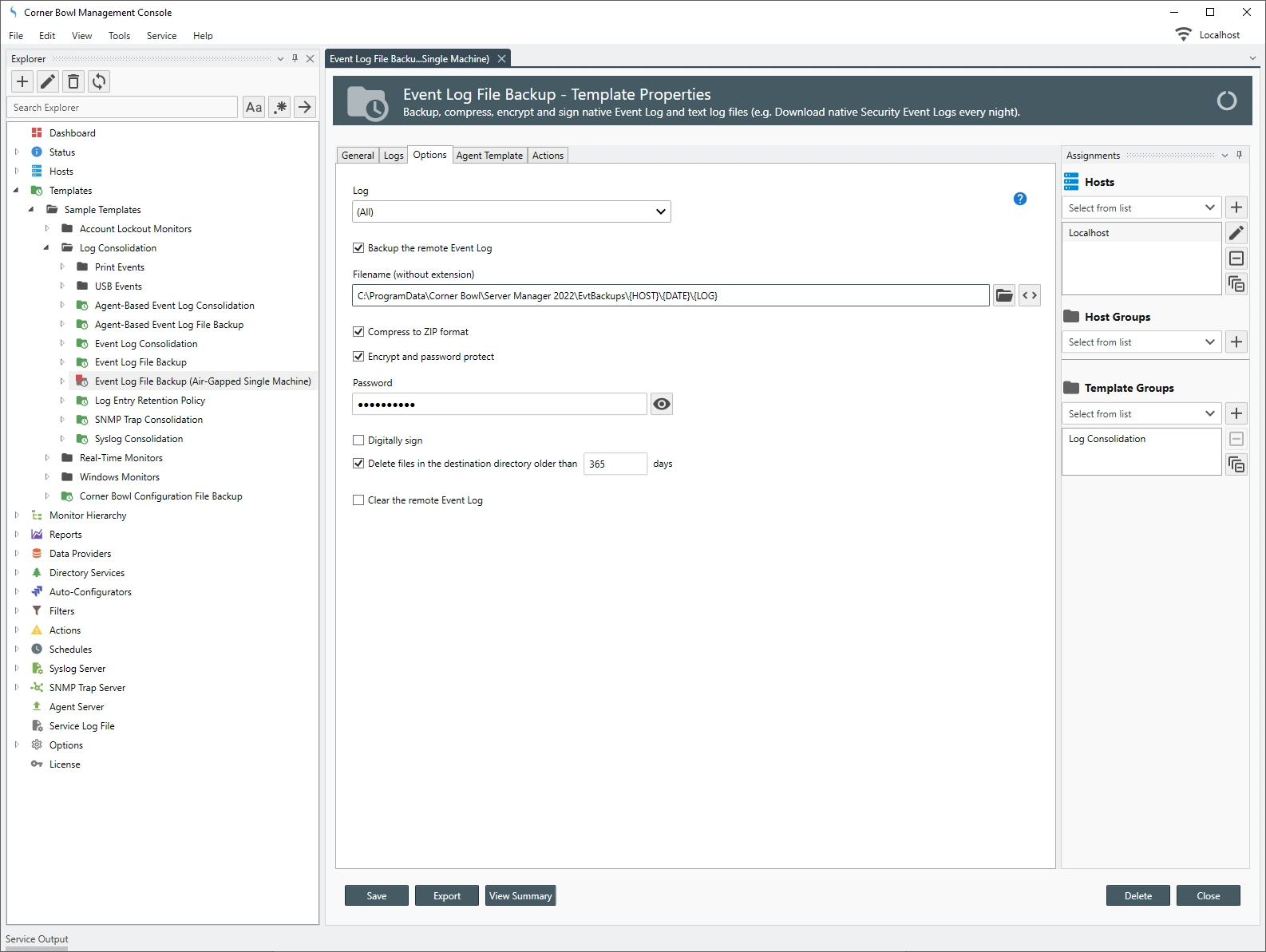 If you're not familiar with Corner Bowl Software, Templates, which contain instructions such as the backup schedule and output location, are assigned to one or many hosts. Once assigned the result is a monitor that executes at the frequency defined in the template. Server Manager includes a sample template called, Event Log File Backup (Air-Gapped Single Machine). With a little modification, this is the template we are going to use.