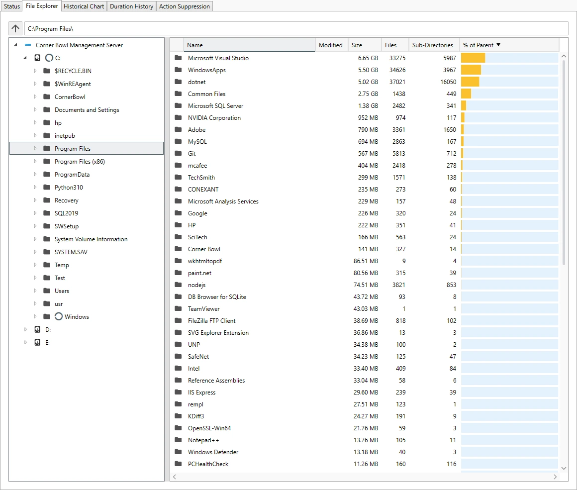 - Back in the Monitor Status View, select the File Explorer Tab. Use this view to recursively scan disks then use the results to track down the largest disk space consuming directories.