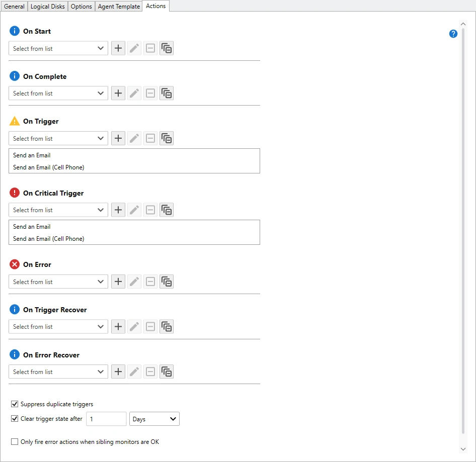 - Use the Action Suppression Tab to temporarily disable duplicate actions triggered each time the monitor runs on this particular server.