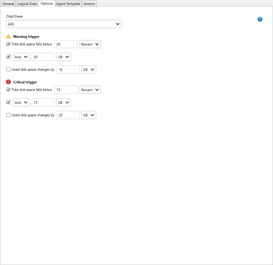 - Use the Free disk space falls below check box to enable the free disk space monitor then specify the threshold Value and Units. Optionally, if monitoring by percentage of free disk space, check the option to enable an additional And or Or threshold to limit false positives.