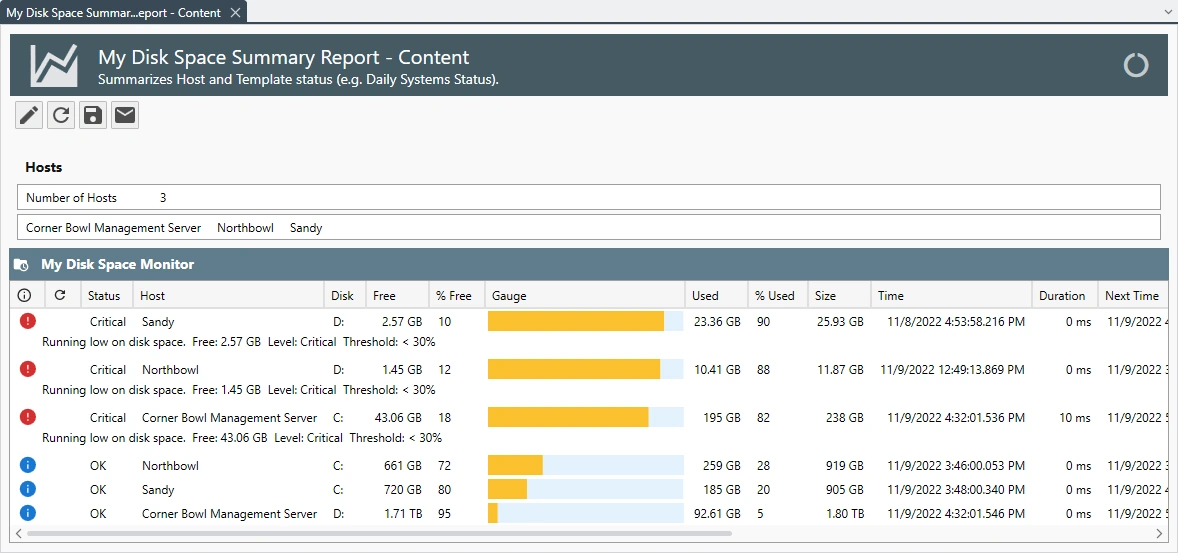 Once you have assigned your Disk Monitor Template to all of your target hosts or host groups the target hosts reside, you are ready to create a daily Disk Space Summary Report.