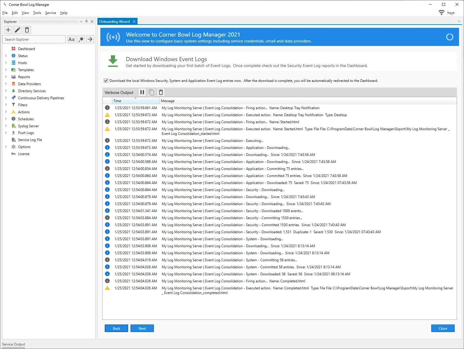 - The last step consolidates the Application, System and Security logs from system the service is installed to the log repository database we just configured.