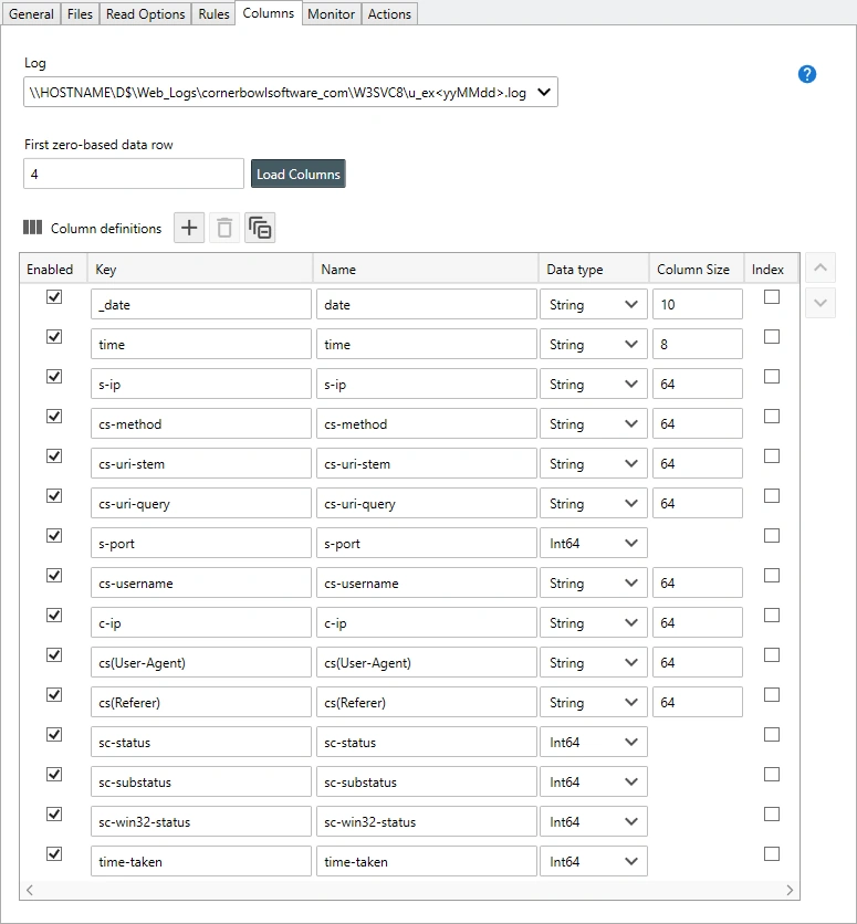 In Parts 1 of the tutorial series, we discovered the W3C IIS web server log file then loaded the definition of the file into Corner Bowl Server Manager. In this tutorial we will monitor the c-ip column, however any column can be monitored. Here's screenshot of the previous configuration we created: