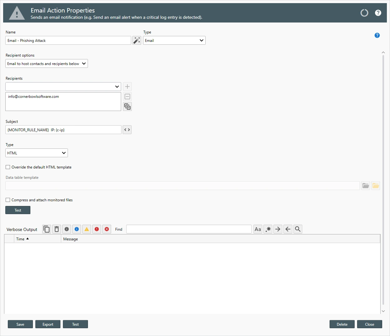 - Use the Actions drop-down to select the action to fire. Since we want to include the IP address in the subject, we need to create a new email Action (see below). Once you have created your new action, assign the action to your rule.
