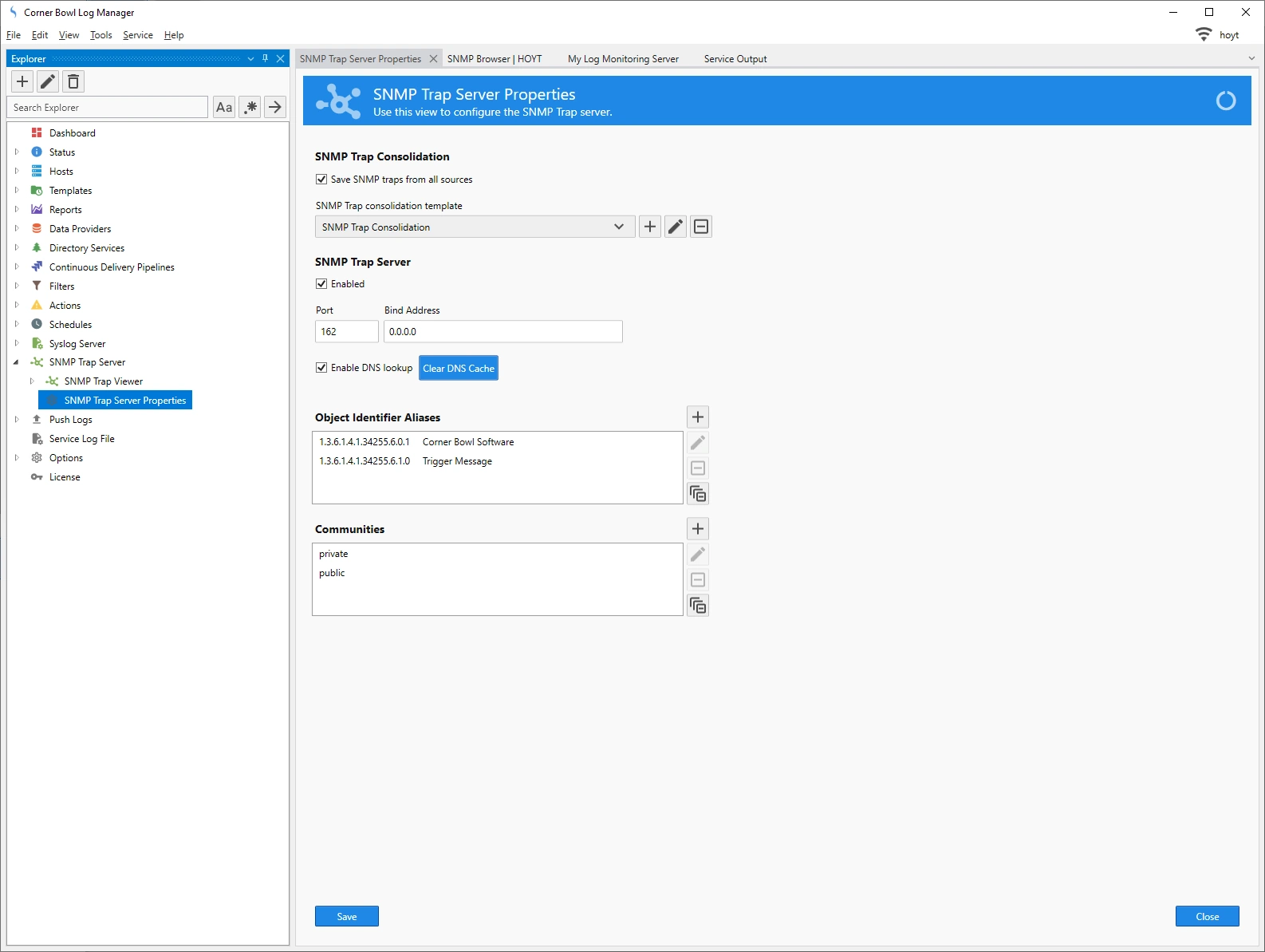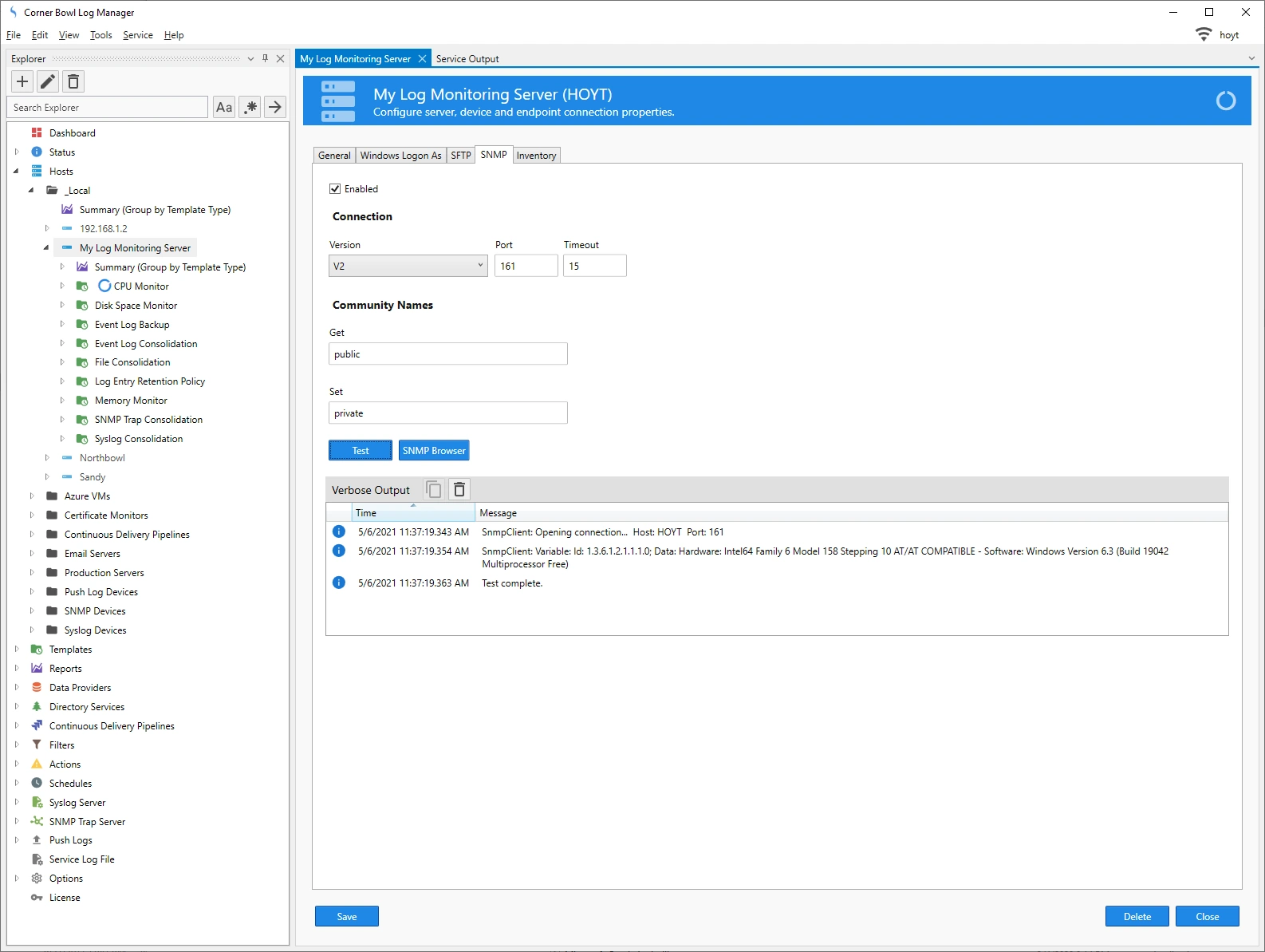 To access the SNMP functionality within Corner Bowl Event Log Manager you will need either a Corner Bowl Server Manager license or a Corner Bowl Internet Server Monitor license.