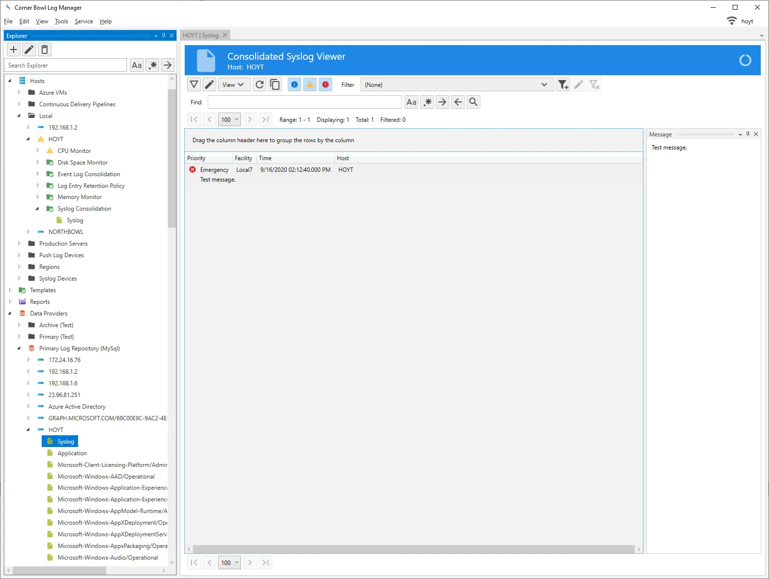 - Back in the Real-Time Syslog Viewer we should see our test message.