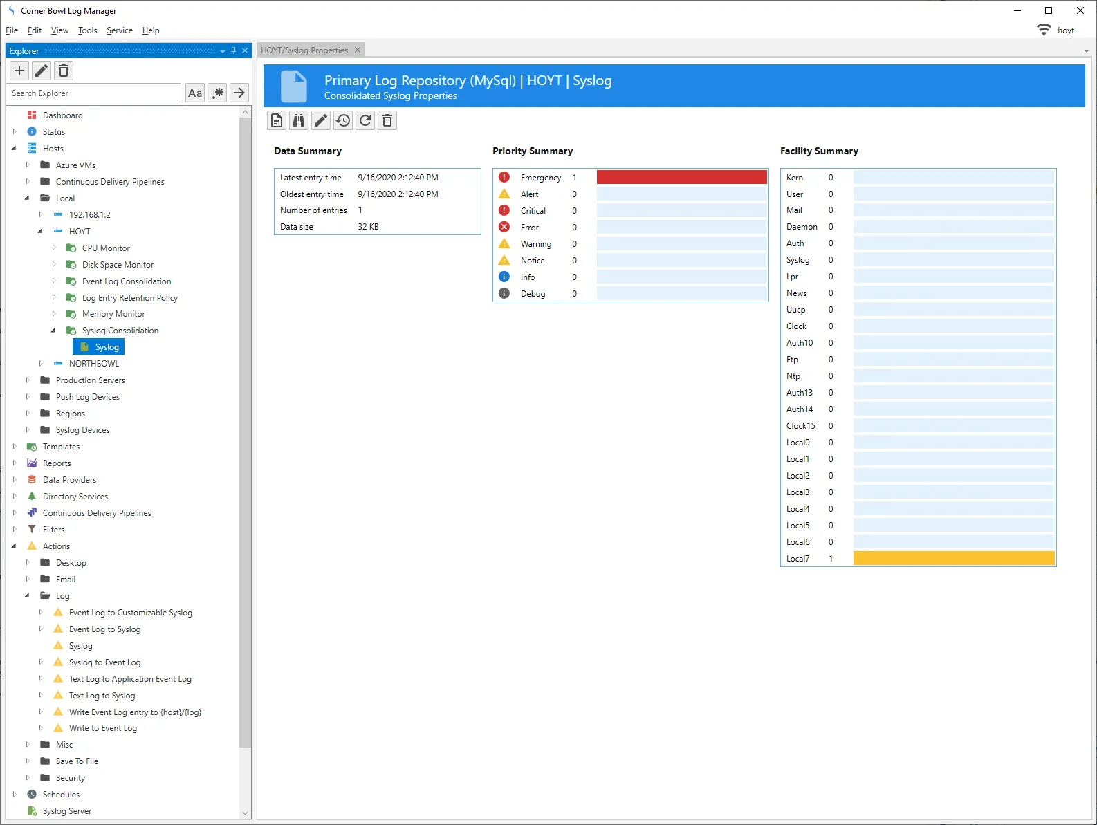 - Next, I want to show the consolidated syslog properties. Back in the Explorer view, right click on the Syslog item again and this time select Data Properties