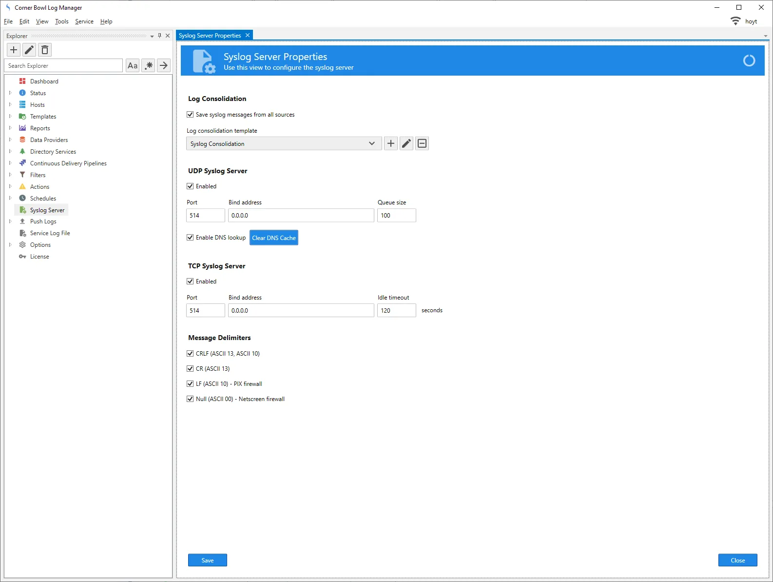 - If you have Linux machines pushing syslog messages, checking the Enable DNS lookup option allows the software to save the Linux syslog messages under each machine's hostname rather than IP address.