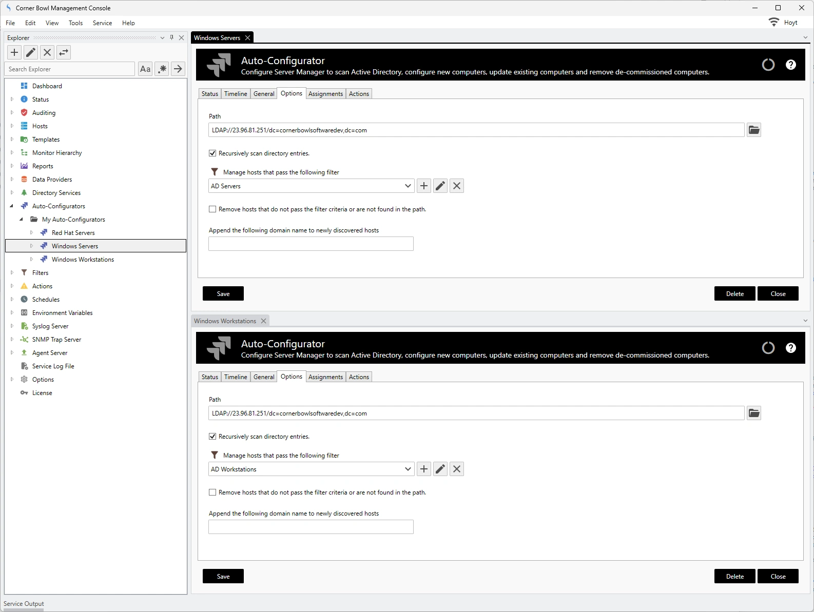 Auto Configurators enable network administrators to synchronize Corner Bowl hosts with Active Directory hosts. Once added to Corner Bowl, hosts are then assigned to various Host Groups, Templates, Template Groups, Reports and Report Groups.