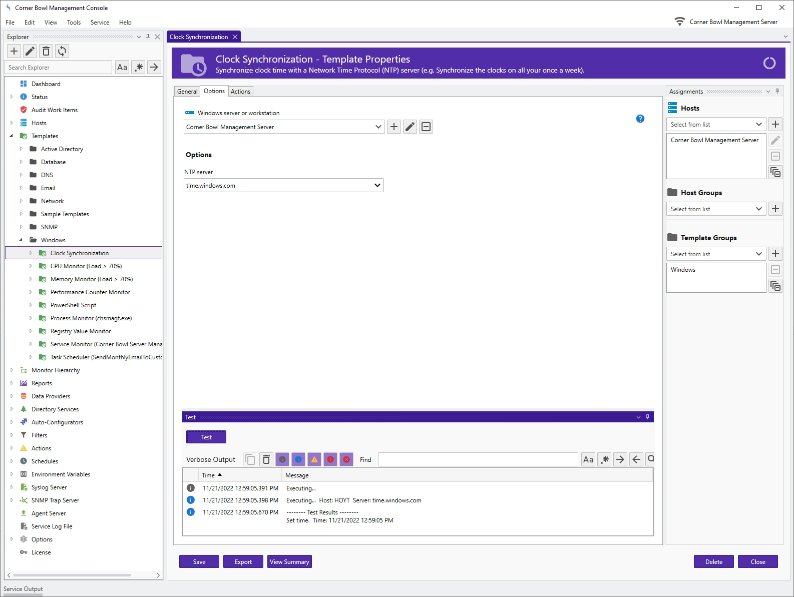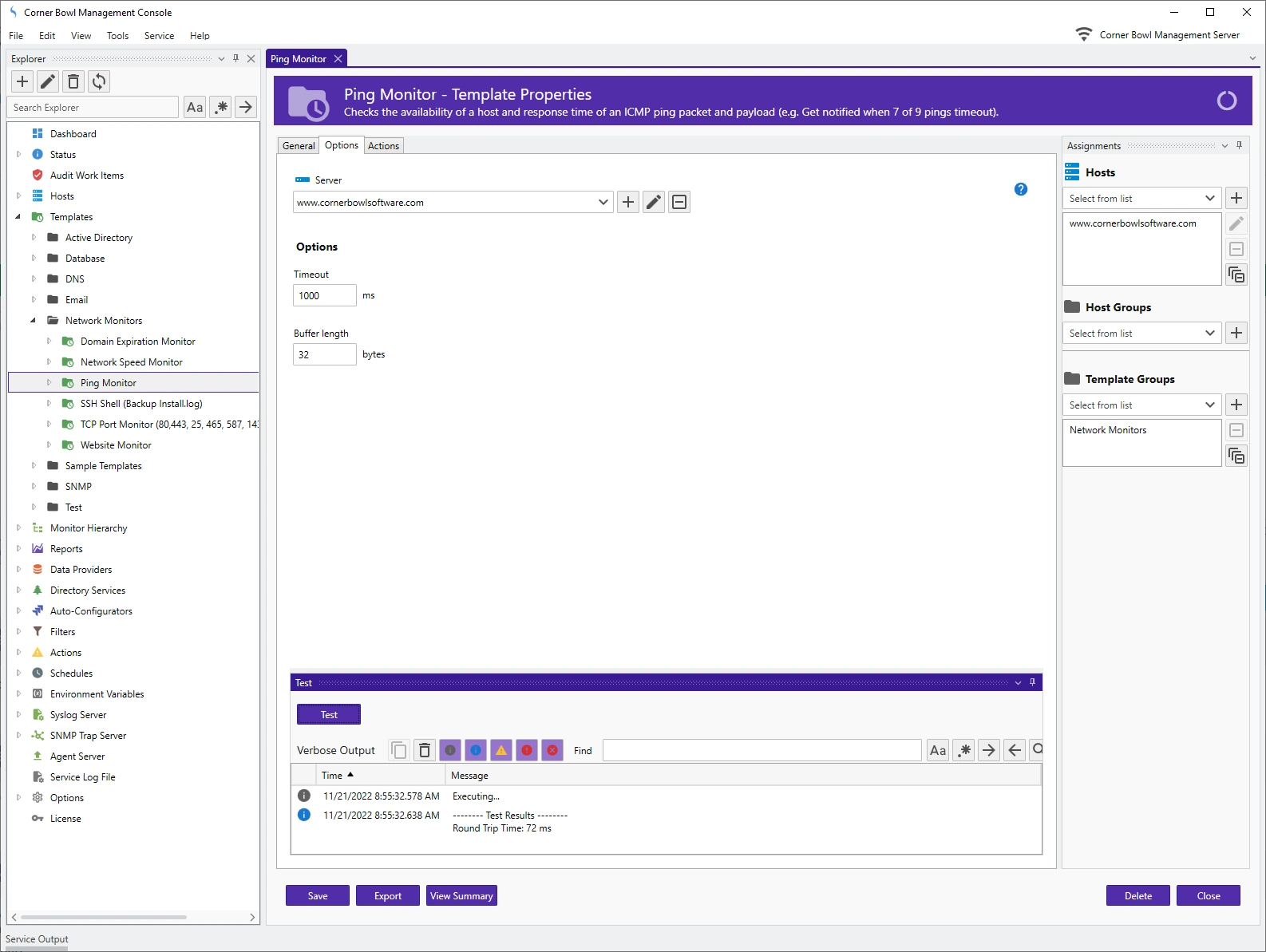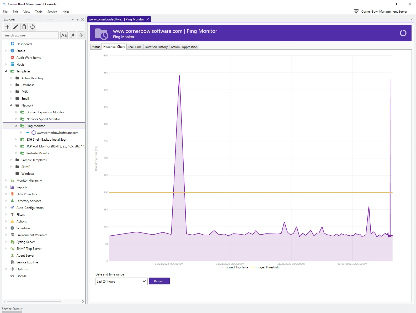 Corner Bowl not only checks the availability of server applications but in most cases includes functionality to test the application performance. For example, our website monitor template includes options to check both the response code and contents.