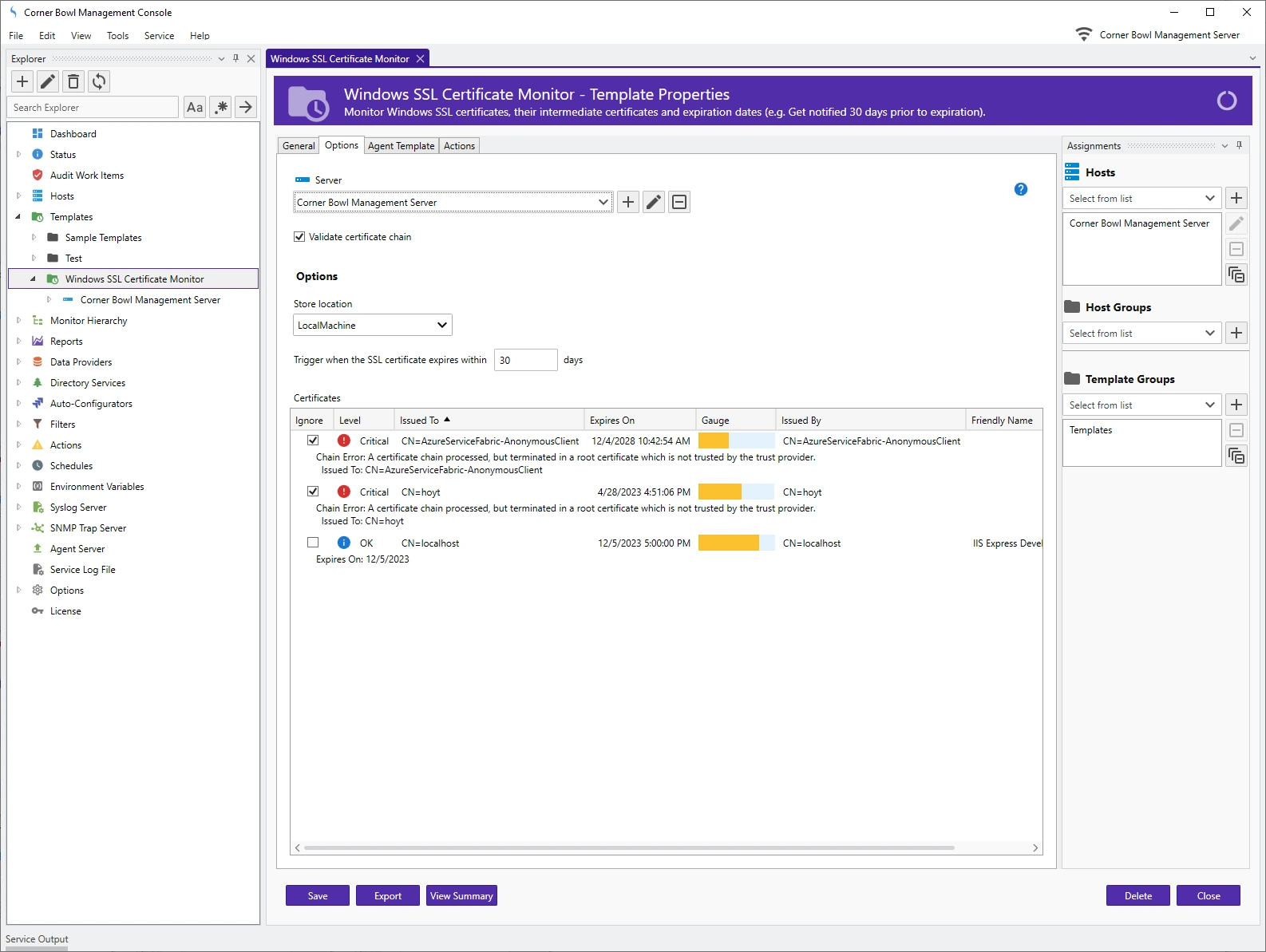 Monitor Windows SSL certificates, their intermediate certificates and expiration dates (e.g. Get notified 30 days prior to expiration).