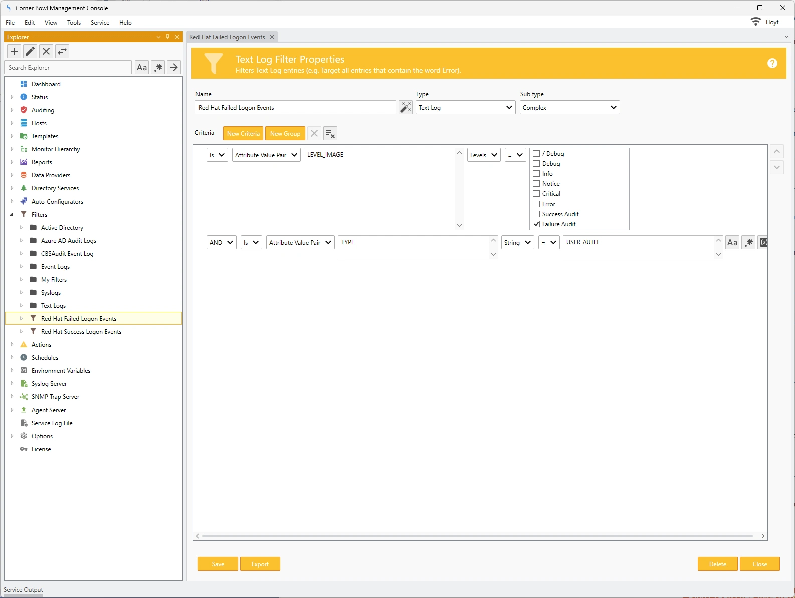 - Create complex programming style filters from log entries that include recursive groups, logical operands, categories, and regular expression driven values.