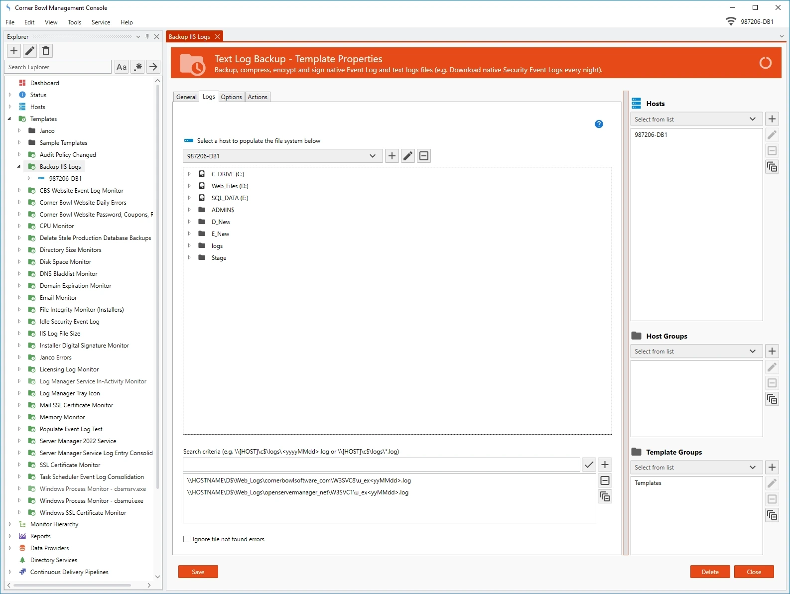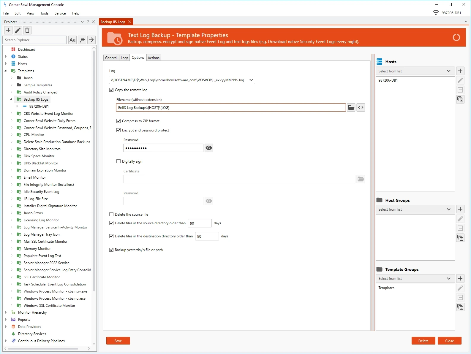 - Centrally save, backup, zip, encrypt and digitally sign text and application logs files in their native format.