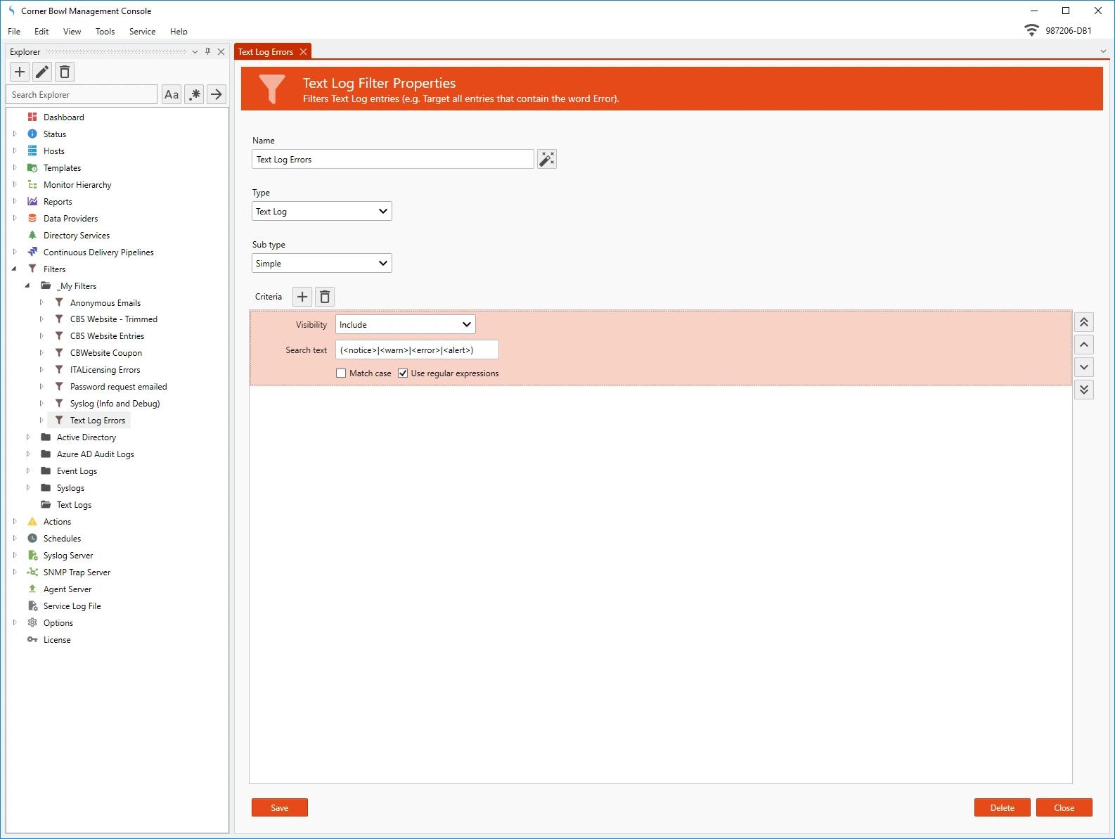 Corner Bowl Text Log Monitor is an extensive enterprise-class SIEM software monitoring and management tool for IT professionals that includes centralized log consolidation to native format, SQL Server, MySQL or SQLite, real-time and scheduled text log monitoring and application log file monitoring, a powerful text log analyzer with paging support for large files, IIS, W3C and CSV file support, regular expression support, and more. Text Log Monitor will help you fulfill compliance requirements for CJIS, CMMC, JSIG, NIST, GDPR, HIPAA, PCI/DSS and SOX.