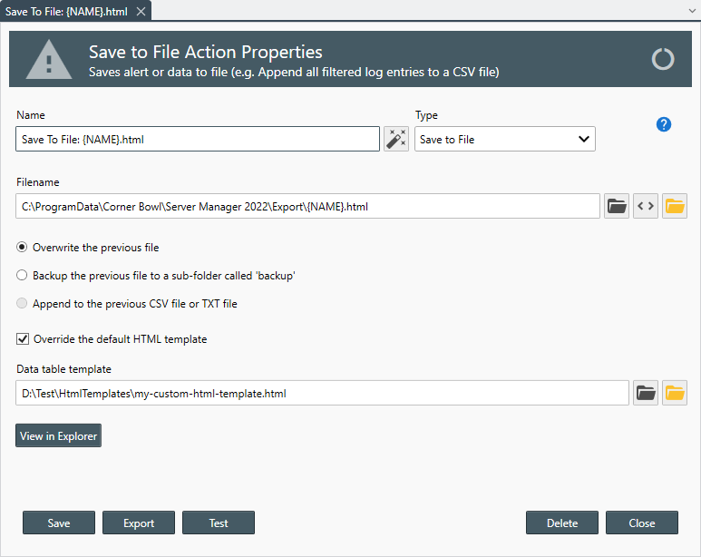- Use the Override the default HTML template option to specify your own HTML template. If selected, use the Data table template control to select the .html file to use in-place of the default file:C:\Program Files\Corner Bowl\Server Manager\HtmlTemplates\data-template.html