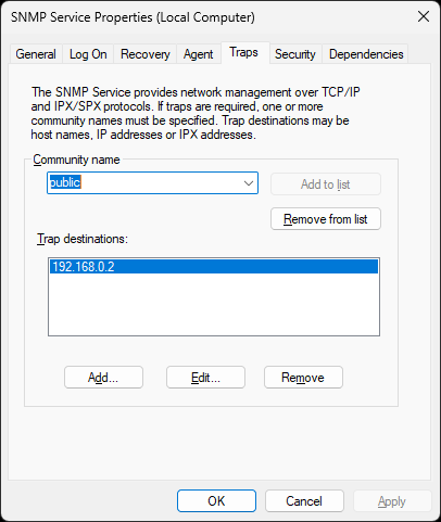 - From the Accepted community names controls, add the community name you would like to use, for example, public.