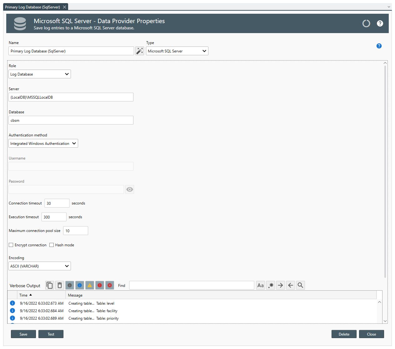 When saving a Log Database or Log Archive Database, if the database does not exist, the database and several tables are automatically created.