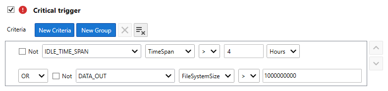 - Use the Warning and Critical Trigger controls to specify the columns to filter. Use the IDLE_TIME_SPAN column to monitor idle time. Use the DATA_OUT column to monitor the amount of data transferred from the server to the user's desktop.