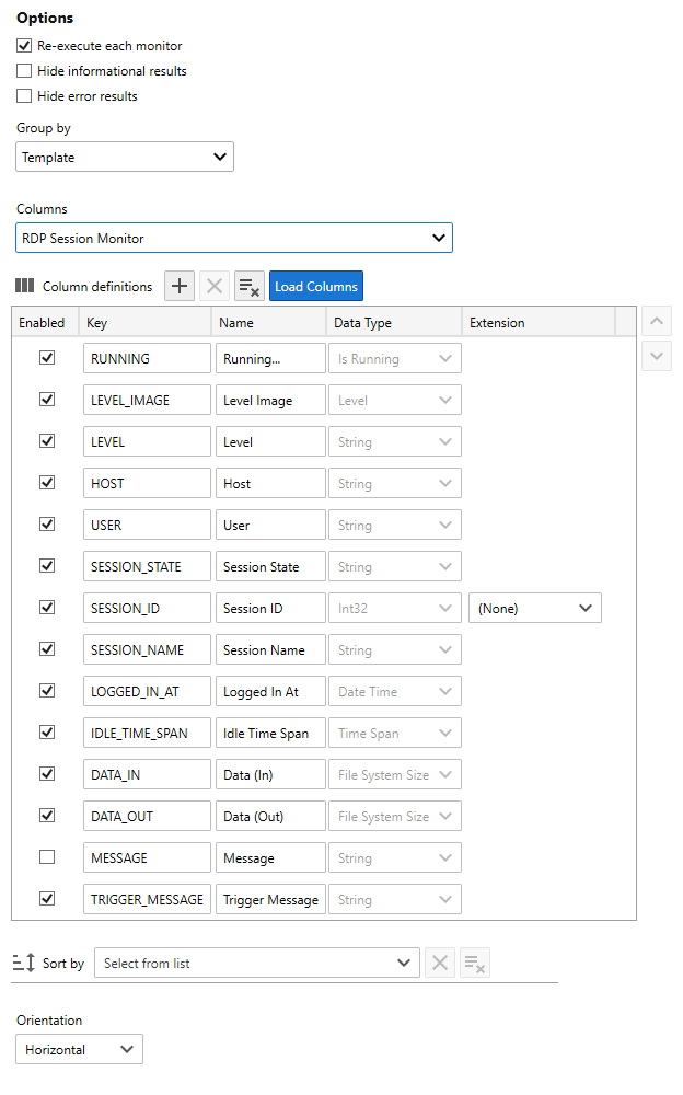 - Use the Options Tab to configure the trigger criteria and RDP Session instance Actions. This view displays a read-only view of the columns which will be returned.