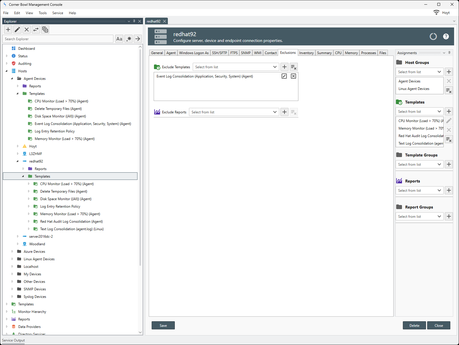For example, if you have a Host Group called Servers and you assign 3 Windows domain controllers, a Linux email server and an Event Log Consolidation Template to the Host Group, use the Exclude Templates option to exclude the Event Log Consolidation Template from the Linux server. Once excluded the Event Log Consolidation Template not be scheduled to run against the Linux server and will not display as an assigned template in the Explorer view under the Linux server.