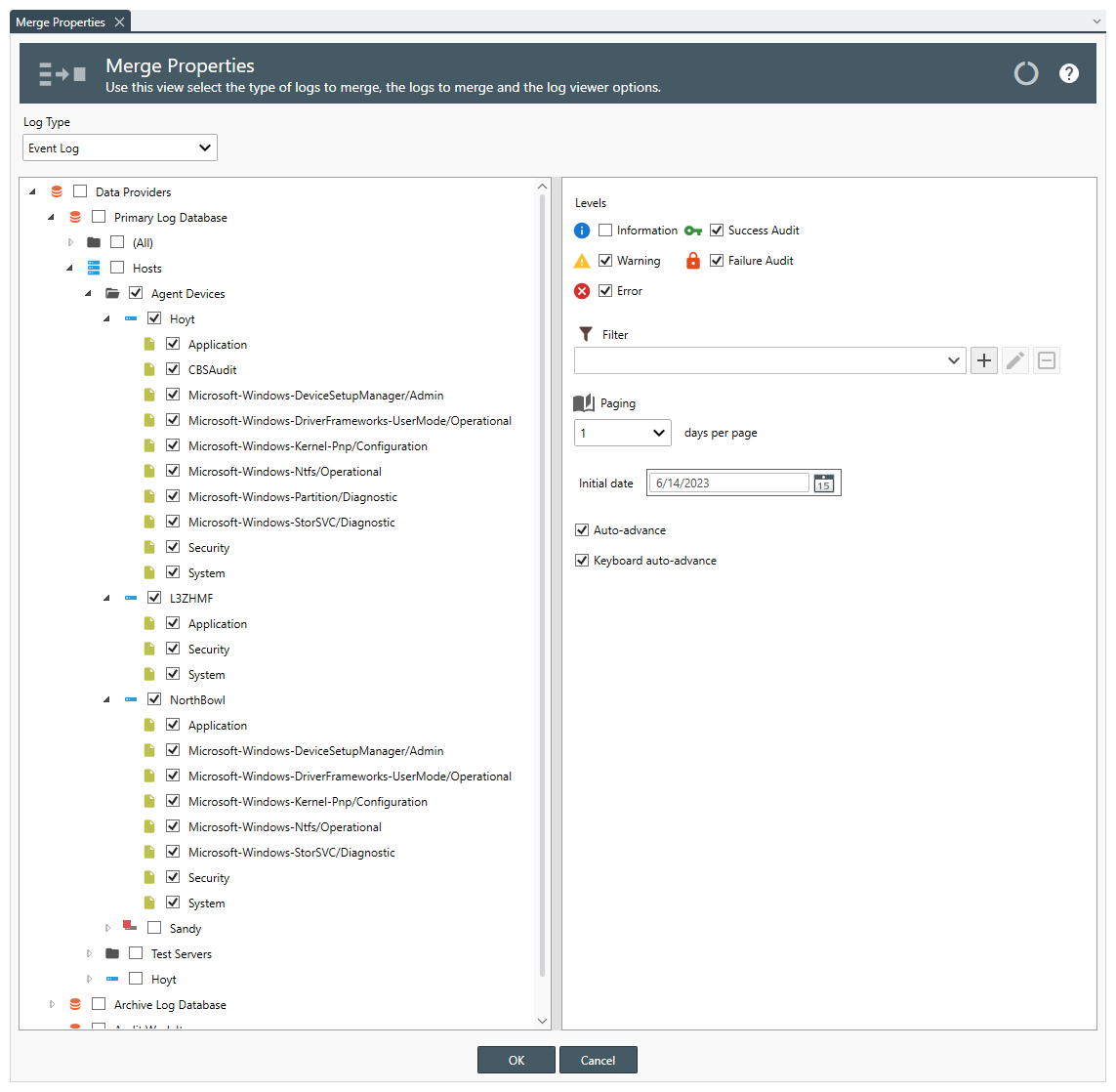 - Click OK to query, filter and merge the log entries into the Merge Log Viewer.