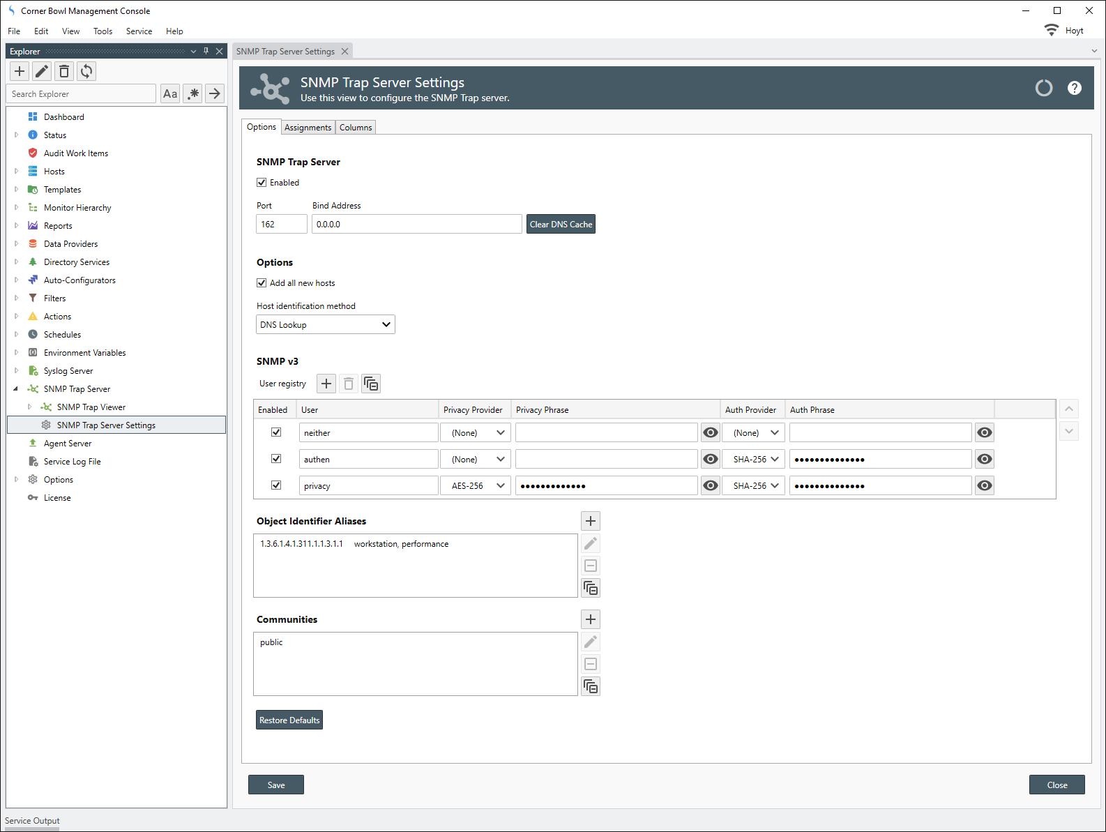 Server Manager contains an internal SNMP server. The SNMP server can be used to receive and forward traps from both computers and devices such as switches, routers, firewalls, and Unix and Linux servers. By default, when a trap is received from a device, the Server Manager automatically adds the device's IP or hostname to the Explorer view and if Trap Consolidation is enabled, the trap saved to the Primary Data Provider.