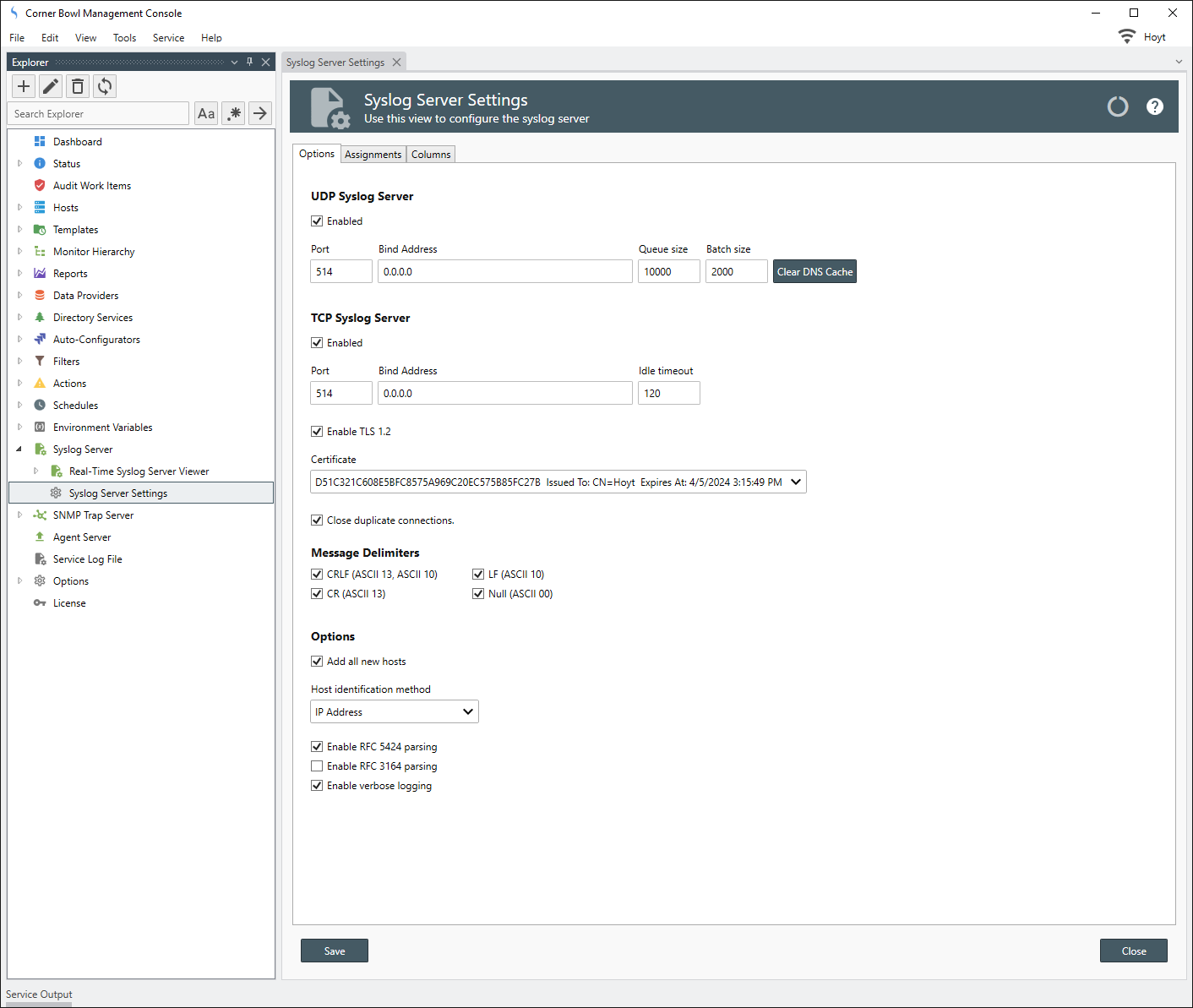 Server Manager contains both UDP and TCP Syslog Servers. These syslog servers can be used to save, backup, relay, and monitor syslog messages from hardware devices such as switches, routers, firewalls or any computer that supports syslog such as Linux servers. By default, when a message is sent from a device, the receiving Syslog server automatically adds the device's IP or hostname to the Explorer View then automatically saves all messages to Server Manager's centralized syslog database.
