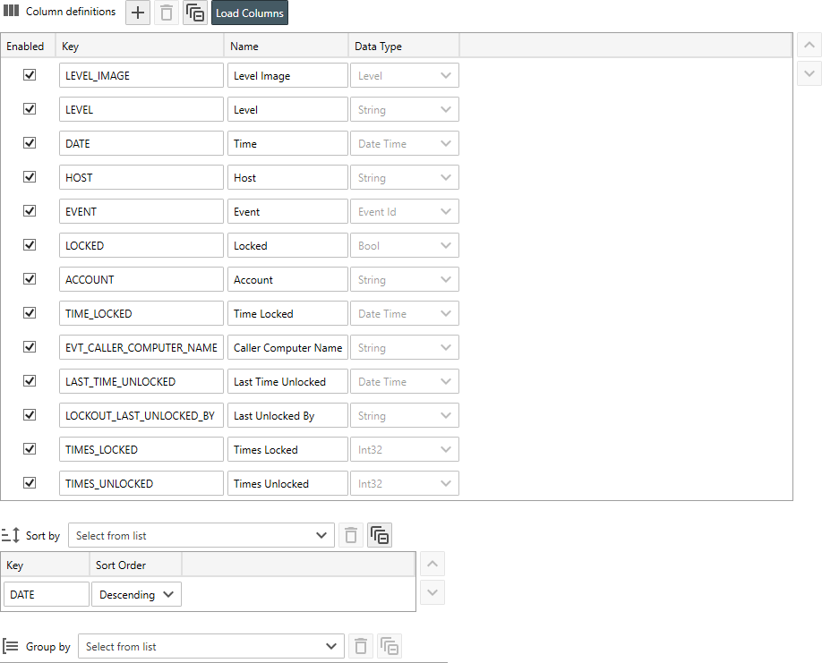 | Show account lockout history | Shows all 4740s then overlays corresponding 4767 events to show the total number of times an account has been locked out and how many times an administrator has unlocked the account. Important Windows only logs 4767 account unlock events when an Administrator manually unlocks an account. Windows does not log a 4767 account unlock event each time an account is automatically unlocked. Note When this option is selected, the last administrator to unlock the account is listed. |