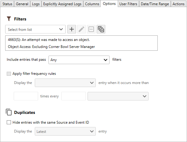 - Use the Duplicates controls to group entries by Source and Event ID then display Latest or Oldest entry along with a count of entries in each group.