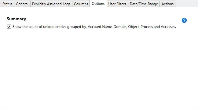 - Use the Summary check box to either display each entry or display the count of unique entries grouped by Account Name, Domain, Object, Process and Accesses.