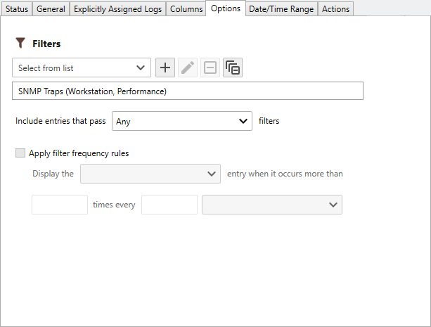 - Use the Apply filter frequency rules to display the Latest or Oldest entry when it occurs more than X times every X periods.