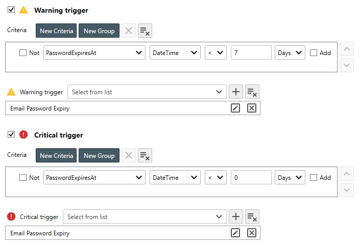- Use the Warning and Critical triggers controls to define trigger filter criteria and value thresholds.