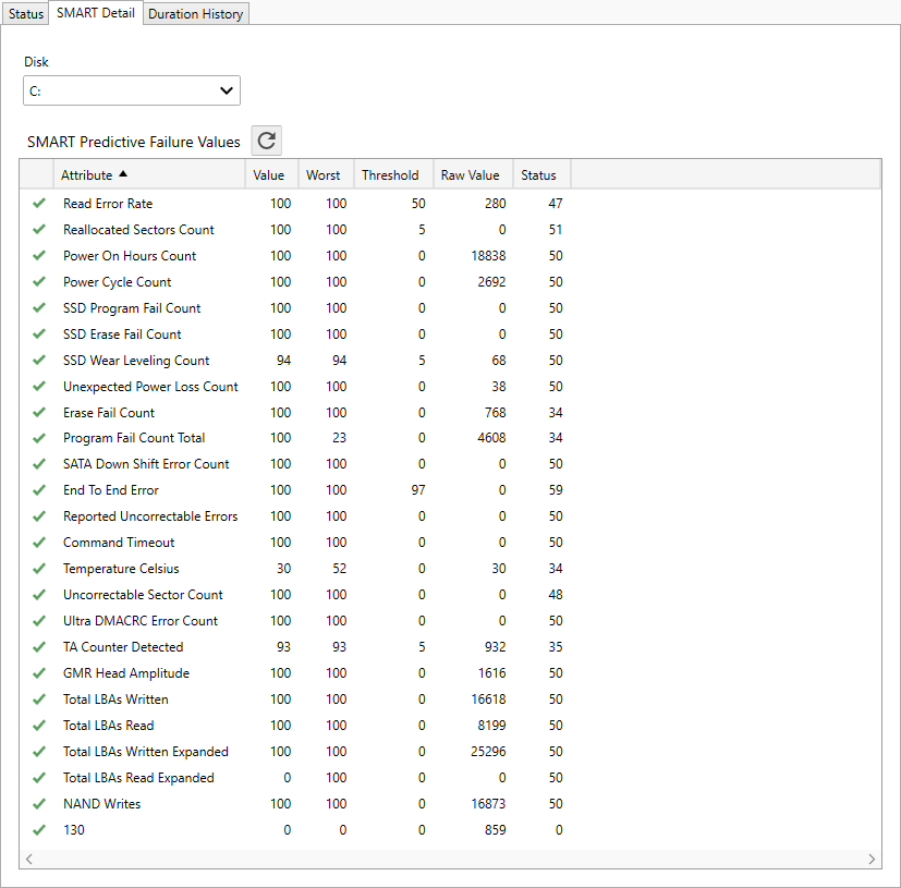 - From the Monitor Detail View, select the SMART Detail tab. Once displayed, the view automatically scans the first disk's SMART predictive failure values.