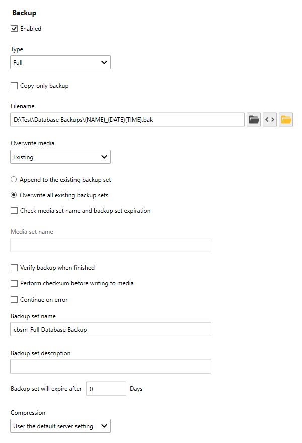 - Use the Compression drop-down to select the compression options. For more information see: Back Up Database (Backup Options Page)