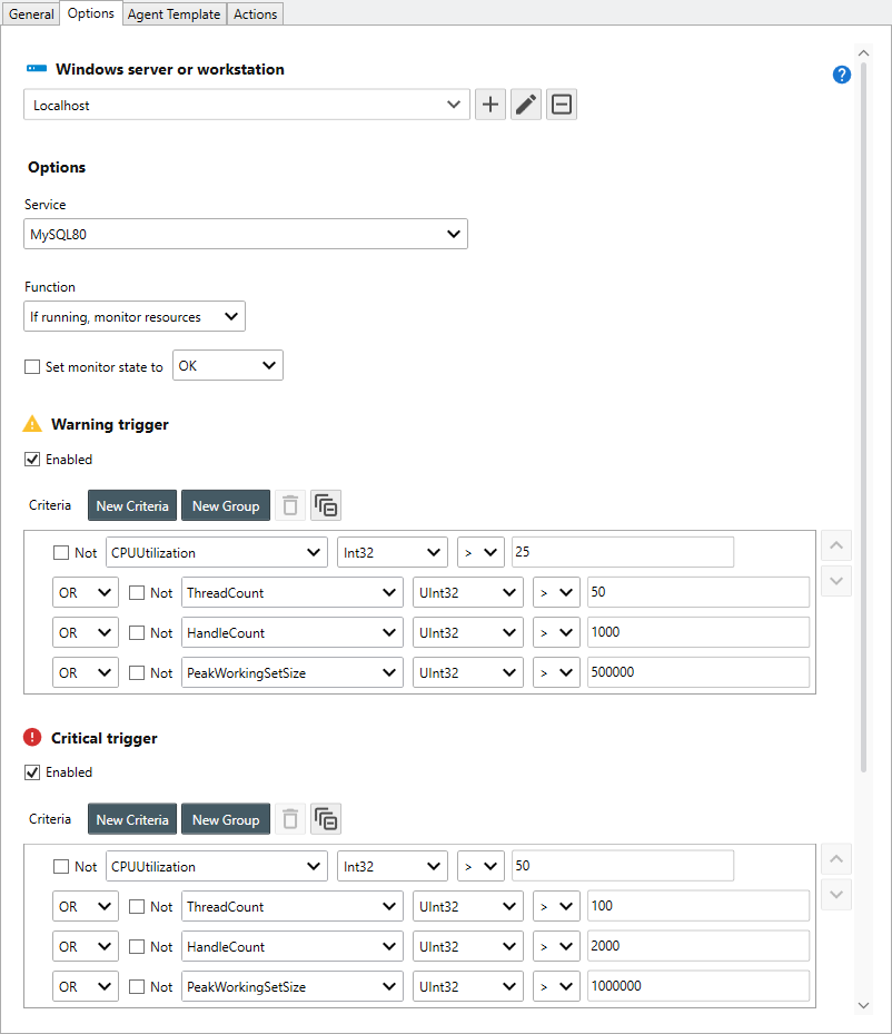 | If running, monitor resources | If the service is running, monitors the trigger criteria, otherwise, the monitor fires critical actions. |