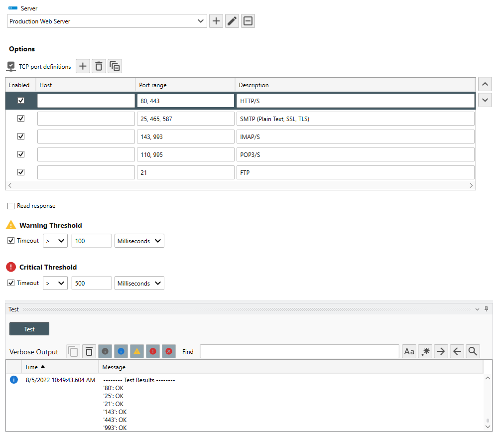The TCP Port Scan Template enables you to validate a TCP server is available and optionally returns a packet. This template is typically used to notify network administrators when a network server application is down or slow to respond.