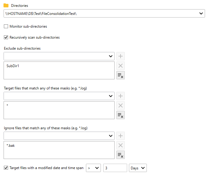 - Use the Target files with a modified date and time span controls to target files that have a modified date and time that is either greater than or less than the current date and time minus the specified time span.